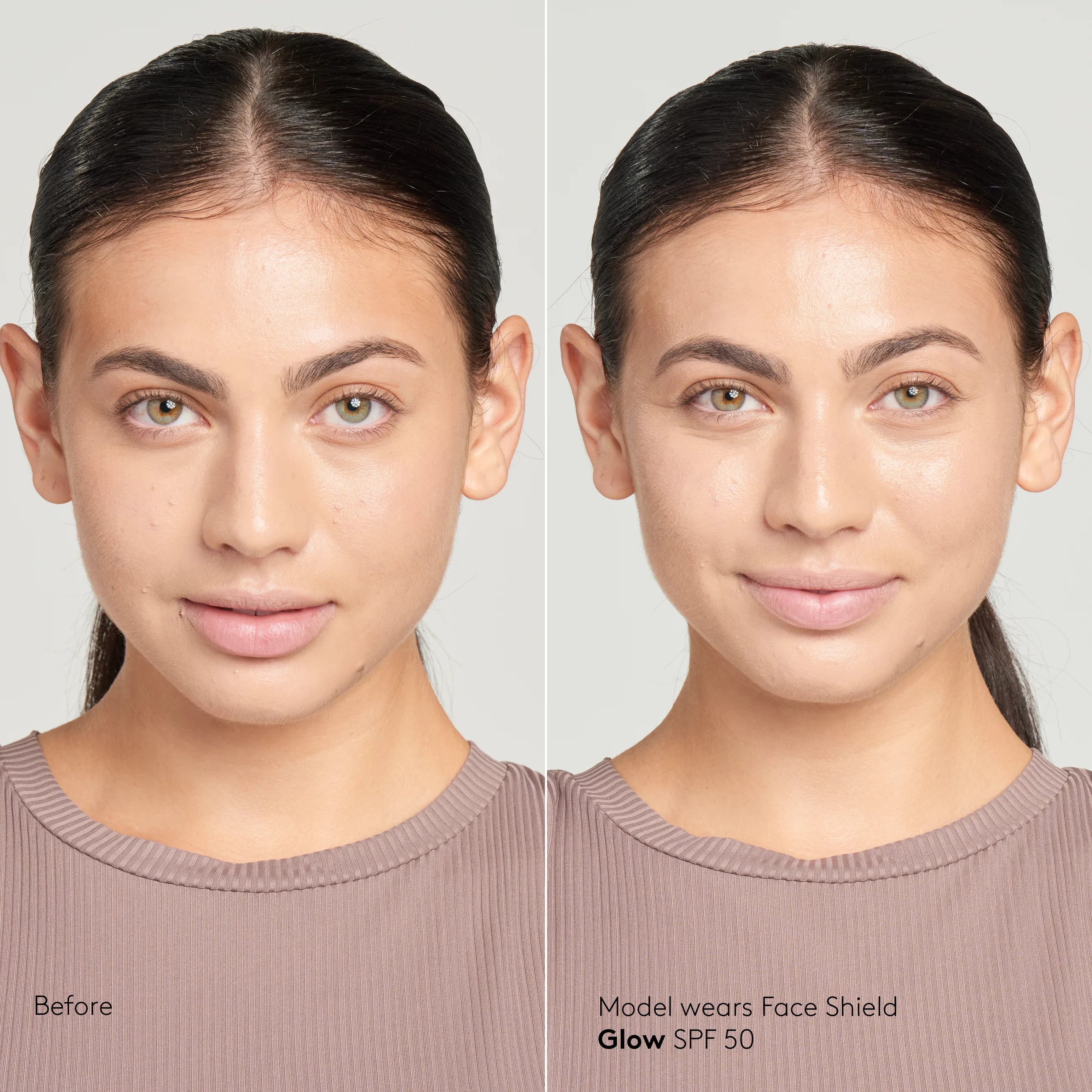 Powered by EnviroScreen ® Technology, Colorescience Face Shield™ Glow is a lightweight, antioxidant-rich, all-mineral liquid glow sunscreen that provides complete broad spectrum UVA/UVB protection and a champagne-lit luminosity for a dewy finish.