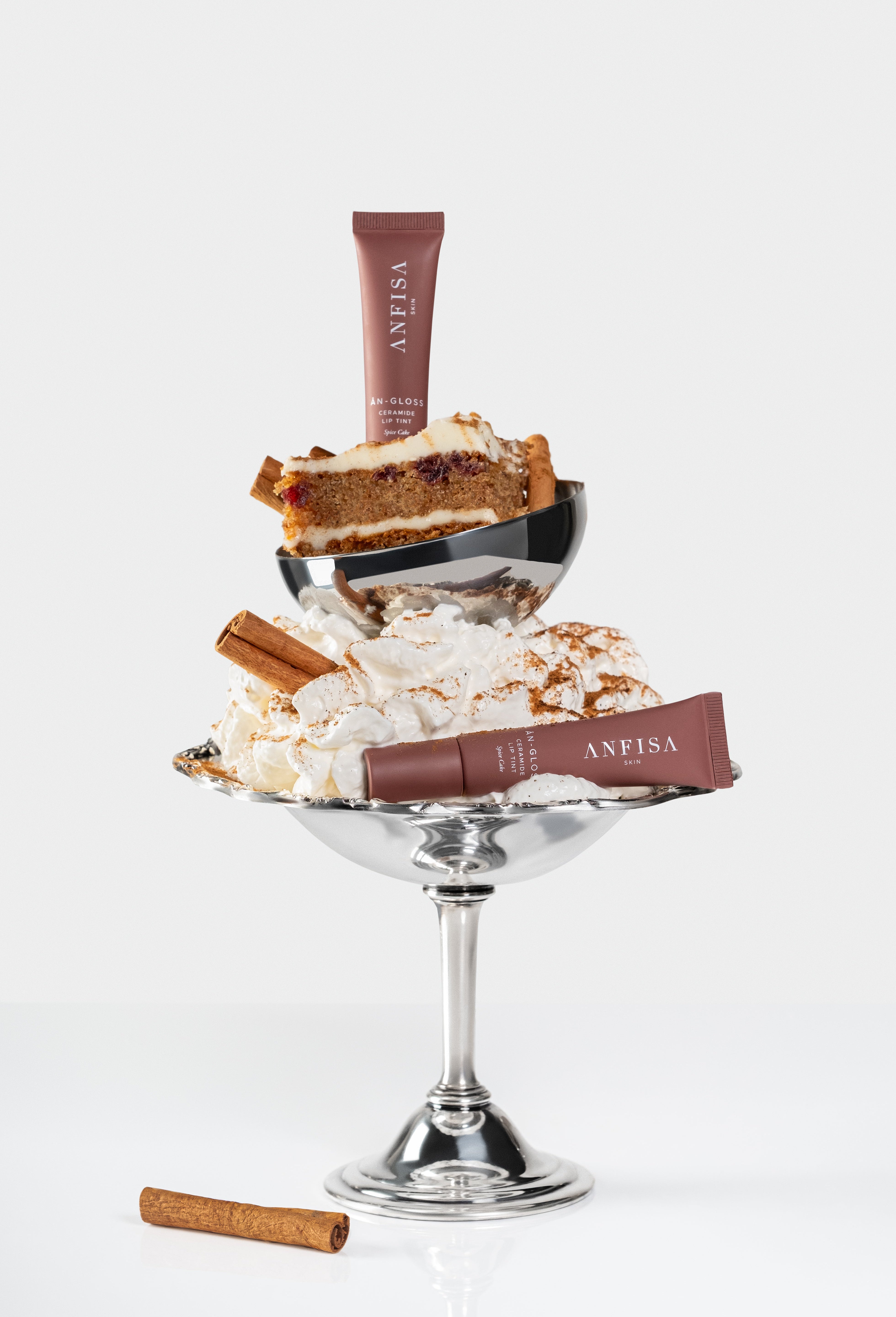 Meet Spice Cake: The award-winning ÂN-GLOSS formula, in a sheer, rosy brown lip tint. Powered by CeraBind Technology™ and infused with five skin-identical ceramides and two plumping peptides, it deeply hydrates and enhances fullness, while Cooling Tip Technology™ soothes on contact.